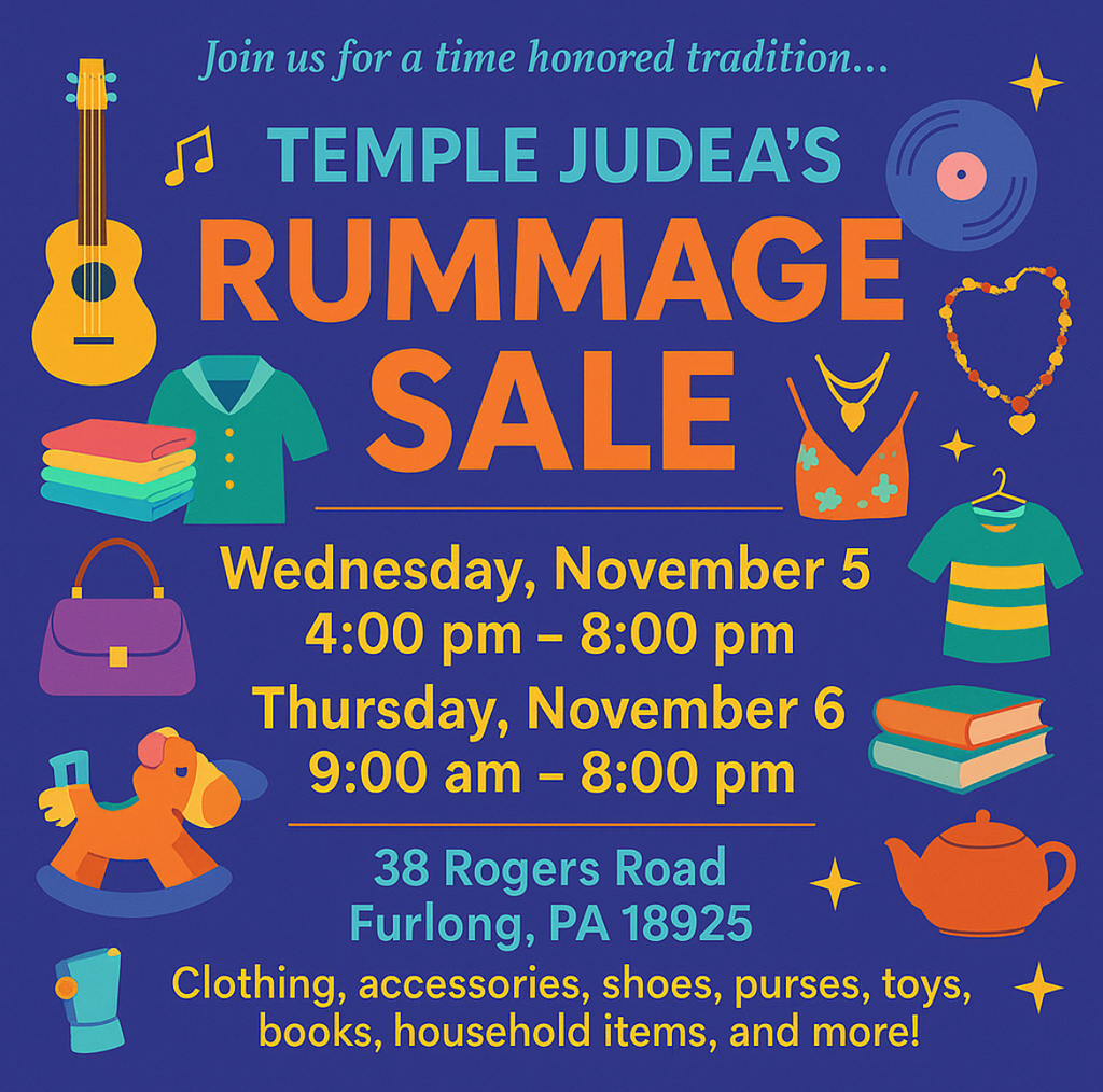 Furlong 38 Rogers Rd Wednesday, 11/5,4 p.m.- 8 p.m., Thursday, 11/6,9 p.m.- 8 p.m. Temple Judea Annual Rummage Sale Over 3000 square feet of new and gently used items! TempleJudeaRummageSale@gmail.com